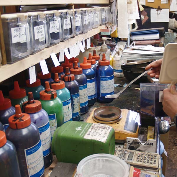 当社では、色の全てをオリジナルカラーとして染料の調合を全て自社にて行います。松煙染、柿渋染の染料にいたるまで細かな調合により色作りを行います。