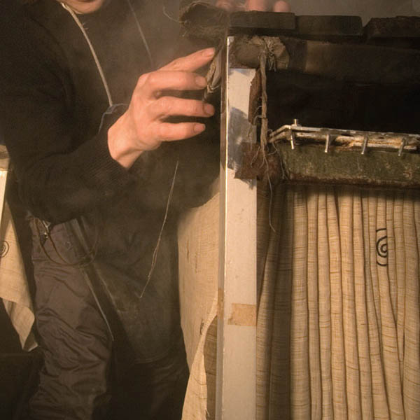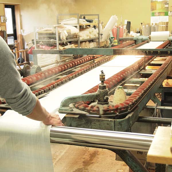 染色された生地は、すぐに独自の技術で高熱の蒸しにかけます。蒸し時間、蒸しの温度、水分率等によりその色合いは大きく変化し、気の抜けない作業となります。微妙な色合い、表情豊かな風合いはここで生まれるといっても過言ではありません。