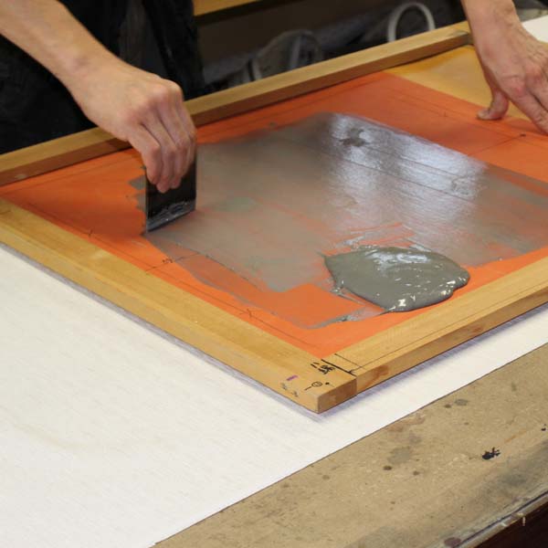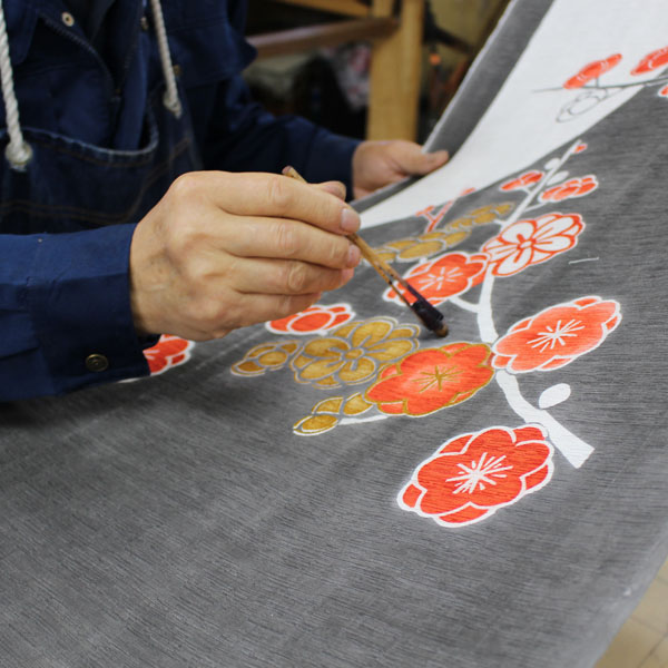 米粉100%でできた糊を型に合わせて生地に摺りこんだり、筒描き等により手作業で糊伏せを行い、多色の場合はそれを繰り返します。