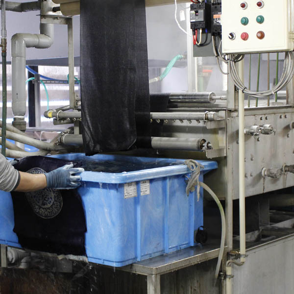 余分な染料と糊を抜くために十分な水洗を行います。完全に糊を落とすことにより、布に本来の風合いが蘇ります。