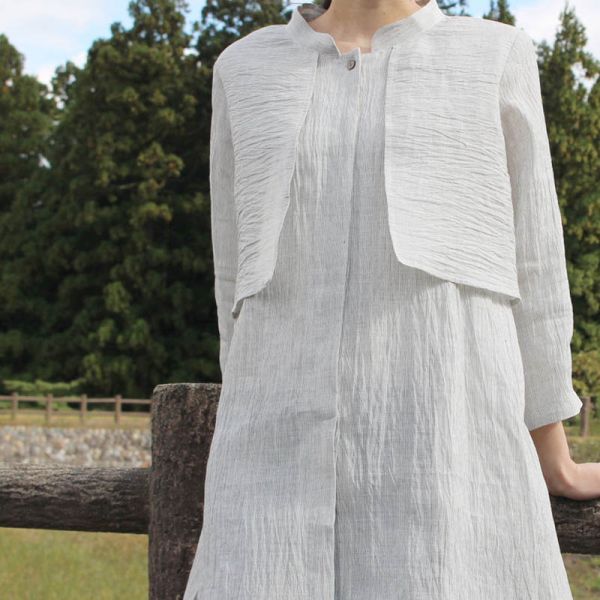 小千谷縮に独自の改良をして広幅に織り上げた「縮布」を使用したファッションです。縮素材は苧麻(ラミー)100%、繊維長が長く吸水性、放熱性に優れ、抗菌性もあり肌にも優しく、何といってもその触感は最高です。上質な質感はフォーマルなイメージさえ演出してくれます。